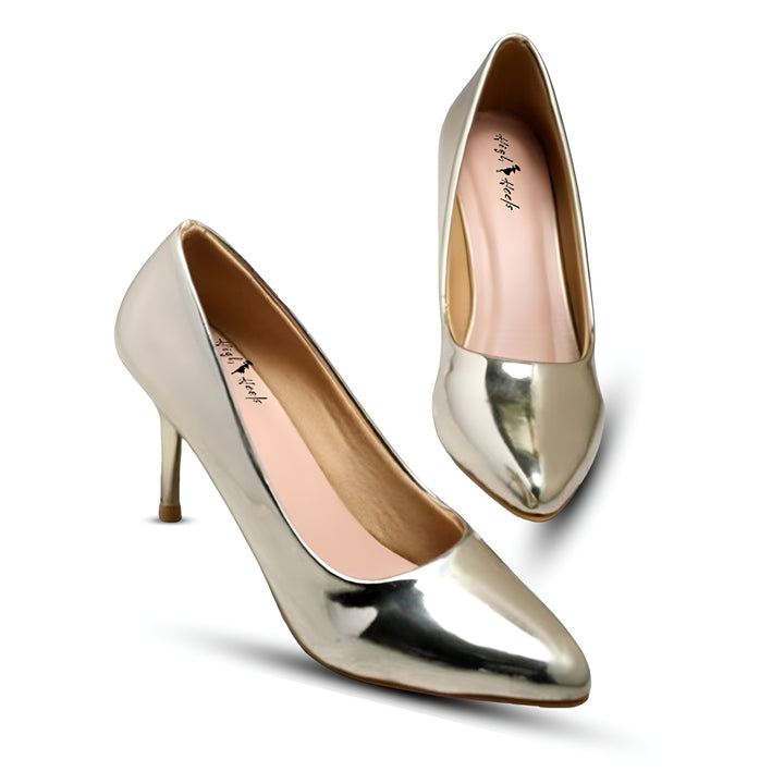 High Heels has perfected the Gold Luxe Heels style. Made from Glassy, soft synthetic rexine, they exude timeless elegance. Their classic black non-slip sole guarantees durability and chic. Featuring a Toe...